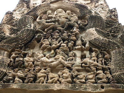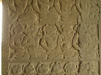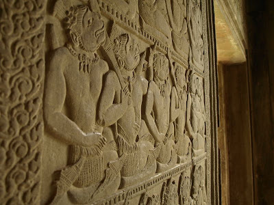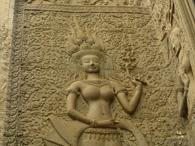 砂岩上雕刻著阿普莎拉Apsara,身材、服飾、型態各異,